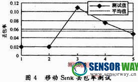 (6)測試結(jié)果評估:由于功率比較小(-25dBm,采用2.4GHz小功率時對障礙物的穿透能量弱),測試過程中環(huán)境較為復(fù)雜、環(huán)境干擾較大,以及網(wǎng)絡(luò)沒有布設(shè)冗余節(jié)點,因此丟包比較嚴重,平均丟包率為5.5%。三跳測試時,有人剛好擋在數(shù)據(jù)源節(jié)點和Sink節(jié)點之間,因此,三跳測試的丟包率最高。
