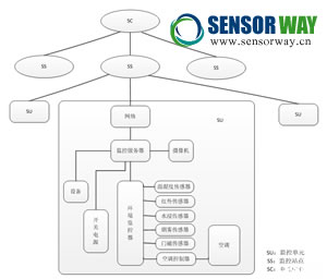 動力環(huán)節(jié)監(jiān)測系統(tǒng)應(yīng)用在機房、基部站等無人值守的環(huán)境中,對局站內(nèi)的通訊電源、蓄電池組、UPS、發(fā)電機、空調(diào)等智能、非智能設(shè)備以及溫濕度、煙霧、地水、門禁等環(huán)境量實現(xiàn)“遙測、遙信、遙控、遙調(diào)”等功能。為了實現(xiàn)對多個量的監(jiān)測,動環(huán)系統(tǒng)集成了各種類的傳感器,是多傳感器集成系統(tǒng)傳感器“多類型”的一個經(jīng)典案例。同時,此監(jiān)控系統(tǒng)充分利用了通訊傳輸設(shè)備所能提供的各種傳輸信道資源,可以實現(xiàn)多級網(wǎng)管,能夠?qū)λ芯终镜娜珔?shù)、全方位的監(jiān)控,這又很好體現(xiàn)了多傳感器集成系統(tǒng)傳感器“多數(shù)量”的一面。動環(huán)監(jiān)測系統(tǒng)的組成如下: