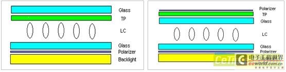 左圖為In-cell結(jié)構(gòu),右圖為:On-cell結(jié)構(gòu)