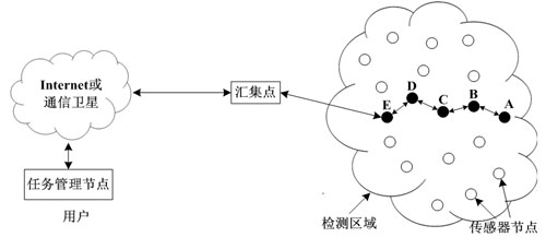 WSN是由大量傳感器節(jié)點(diǎn)組成的一個(gè)自組織的網(wǎng)絡(luò)系統(tǒng),每個(gè)傳感器節(jié)點(diǎn)都具備一定的數(shù)據(jù)采集、處理和無線收發(fā)的功能。雖然每個(gè)節(jié)點(diǎn)的資源和能力都非常有限,但通過節(jié)點(diǎn)間的有效合作,整個(gè)網(wǎng)絡(luò)能夠獨(dú)立完成大范圍、多信號(hào)的準(zhǔn)確檢測(cè),并及時(shí)可靠地反饋采集信息。傳感器節(jié)點(diǎn)布置在檢測(cè)區(qū)域;用戶在控制臺(tái)完成檢測(cè)任務(wù)分配和對(duì)WSN的管理,通過Internet或通信衛(wèi)星,再經(jīng)由匯集點(diǎn)發(fā)送至WSN中相關(guān)節(jié)點(diǎn);相關(guān)節(jié)點(diǎn)采集信息并沿反向路由反饋給用戶。