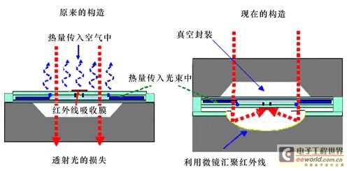 普通的非接觸溫度傳感器元件,很多紅外線都會穿透紅外線吸收膜,因而靈敏度較低。此次通過采用在開發(fā)液晶用背照燈時培育的光波控制技術(shù),開發(fā)出了可使紅外線匯聚到紅外線吸收膜的微鏡。開發(fā)這種微鏡時,研究人員在以往很難形成曲面的硅晶圓上制作出了自由曲面。 由于可在硅晶圓上形成微鏡,因此能在晶圓級別上使傳感器元件與鏡片進(jìn)行真空接合,從而減少釋放到空氣中的熱量,以此提高靈敏度?稍诒3猪憫(yīng)速度不變的情況下將靈敏度提高至原來的7倍。這樣,便可使感應(yīng)區(qū)域擴(kuò)大至原來的7倍。此次開發(fā)的據(jù)該公司介紹,芯片的靈敏度為350V/W,響應(yīng)速度為3ms左右。
